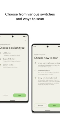 Fungua uwezo kamili wa udhibiti kwa kuweka mipangilio ya swichi unazopenda. Kipengele cha Kufikia Kupitia Swichi inatoa chaguo nyingi za ingizo, kuanzia swichi halisi kama vile vitufe vya USB au Bluetooth, hadi vitufe vya sauti vilivyomo kwenye kifaa chako. Kwa ubunifu zaidi, tumia Swichi za Kamera zinazokuruhusu kuendesha kifaa chako kwa kutumia ishara za uso: tabasamu, inua nyusi, au tazama pande tofauti. Baada ya kuchagua swichi zako, programu hutumia teknolojia mahiri kuchanganua na kuangazia vipengee kwenye skrini yako. Chagua kutoka kwa aina mbalimbali za uchanganuzi, ikiwemo uchanganuzi wa mstari, wa safu mlalo-safu wima, uchanganuzi wa sehemu mahususi, au hata uteuzi wa vikundi kwa usahihi wa hali ya juu. Kila chaguo limeundwa kukupa udhibiti sahihi na wa kibinafsi.