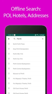 Ukiwa na programu hii, utafurahia mwongozo kamili wa usafiri wa Perth, huku vivutio vyote vikuu vya kitalii vikiwa vimewekwa alama wazi kwenye ramani. Kila kivutio kinakuja na maelezo ya kina kutoka Wikipedia, kukupa ufahamu kamili wa historia na umuhimu wake. Utafutaji wa anwani haujawahi kuwa rahisi hata bila mtandao, na unaweza pia kutafuta maeneo kwa kategoria mbalimbali kama vile viwanja vya ndege, vituo vya treni za chini ya ardhi, stesheni za treni, hoteli, na mengineyo mengi. Programu inakupa uwezo wa kugundua Perth kwa urahisi na ujasiri.