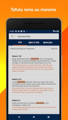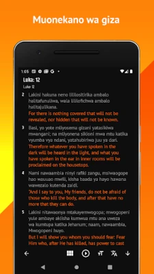 Ukiwa na "Swahili-English Bible (Biblia Takatifu)", una fursa adhimu ya kuchunguza na kutafakari mafundisho ya Bibilia katika lugha mbili muhimu: Kiswahili chetu adhimu na Kiingereza. Mpangilio wake rafiki wa mtumiaji hufanya kusoma na kuelewa maandiko kuwa rahisi na kutosheleza, bila kujali uzoefu wako wa awali na teknolojia. Ghafla, kitabu kitakatifu kinachokuunganisha na imani yako kinakuwa kiganjani mwako, kikikuruhusu kufikia mistari unayoipenda, sura nzima, au hata kutafuta vifungu maalum kwa urahisi mkubwa, huku ukiweza kubadili kati ya lugha hizo mbili kwa mguso mmoja.